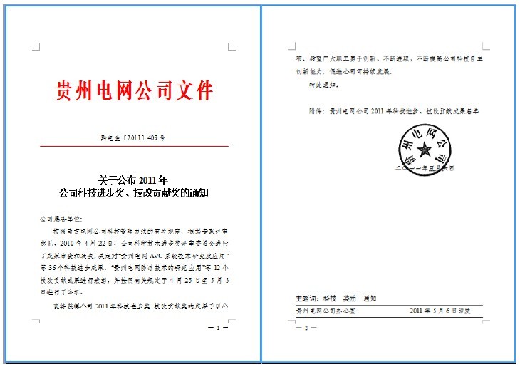 2011年5月,该项目荣获贵州电网科技进步一等奖;11月,荣获南方电网科技进步三等奖。